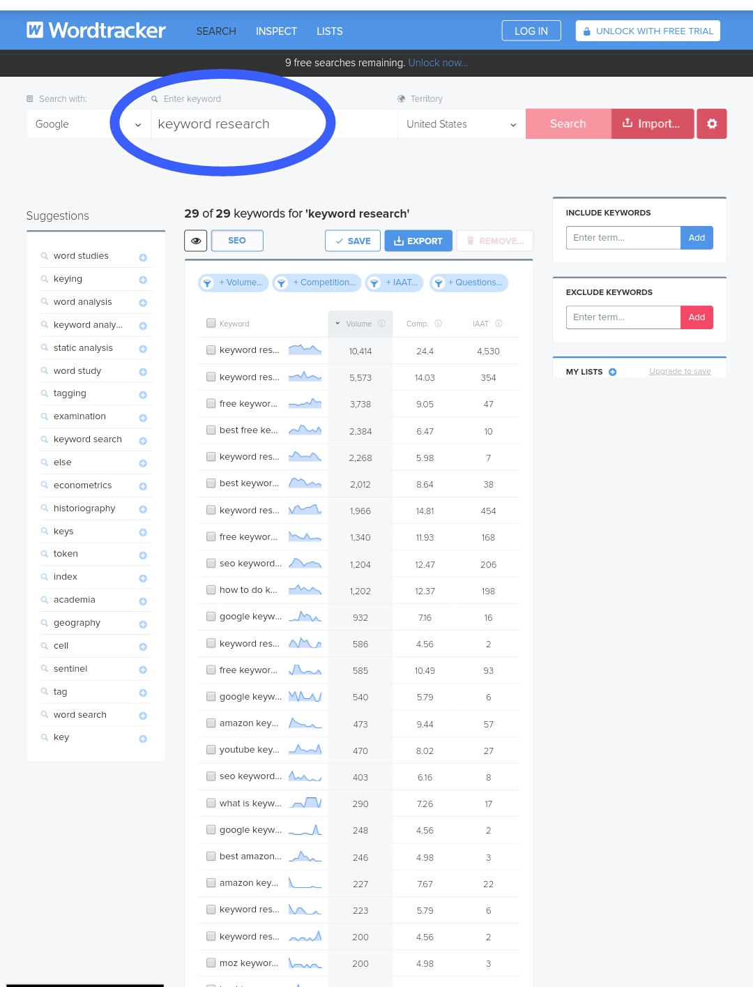 Although Wordtracker has free options limited to 11 free keyword searches, it can be quite useful. If you search from different devices (a laptop and a mobile phone), you can use 22 searches. Similarly to WordStream, you can choose the target country, assess volume and competition, as well as how many website posts have this keyword used in post titles and in articles. Moreover, it also offers keyword suggestions as other tools.