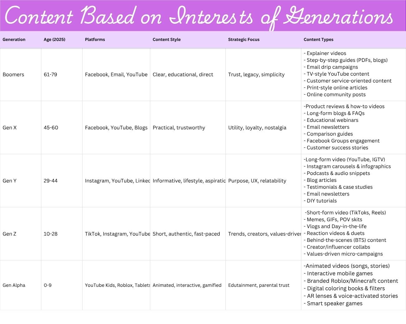 | Audience for Generational Marketing | 1. Baby Boomers – 1946-1964 2. Generation X – 1965-1980 3. Millennials or Gen Y – Born 1981-1996 4. Gen Z or Zoomers – 1997-2012 5. Gen Alpha – from 2013 | 1. Hard work, orientation on results 2. Adaptability, flexibility, independence 3. Purpose-driven, team players, focus on life-work balance and diversity 4. Tech-savvy, entrepreneurial, socially responsible, focus on inclusion 5. Value personalized attitude and immersive experiences | 1. Brand value and customer service 2. Fast service, easy-to-se products 3. Decide based on peer recommendations and experiences 4. Need for product research before making the buying decision 5. Influenced by parents and in-person experiences |